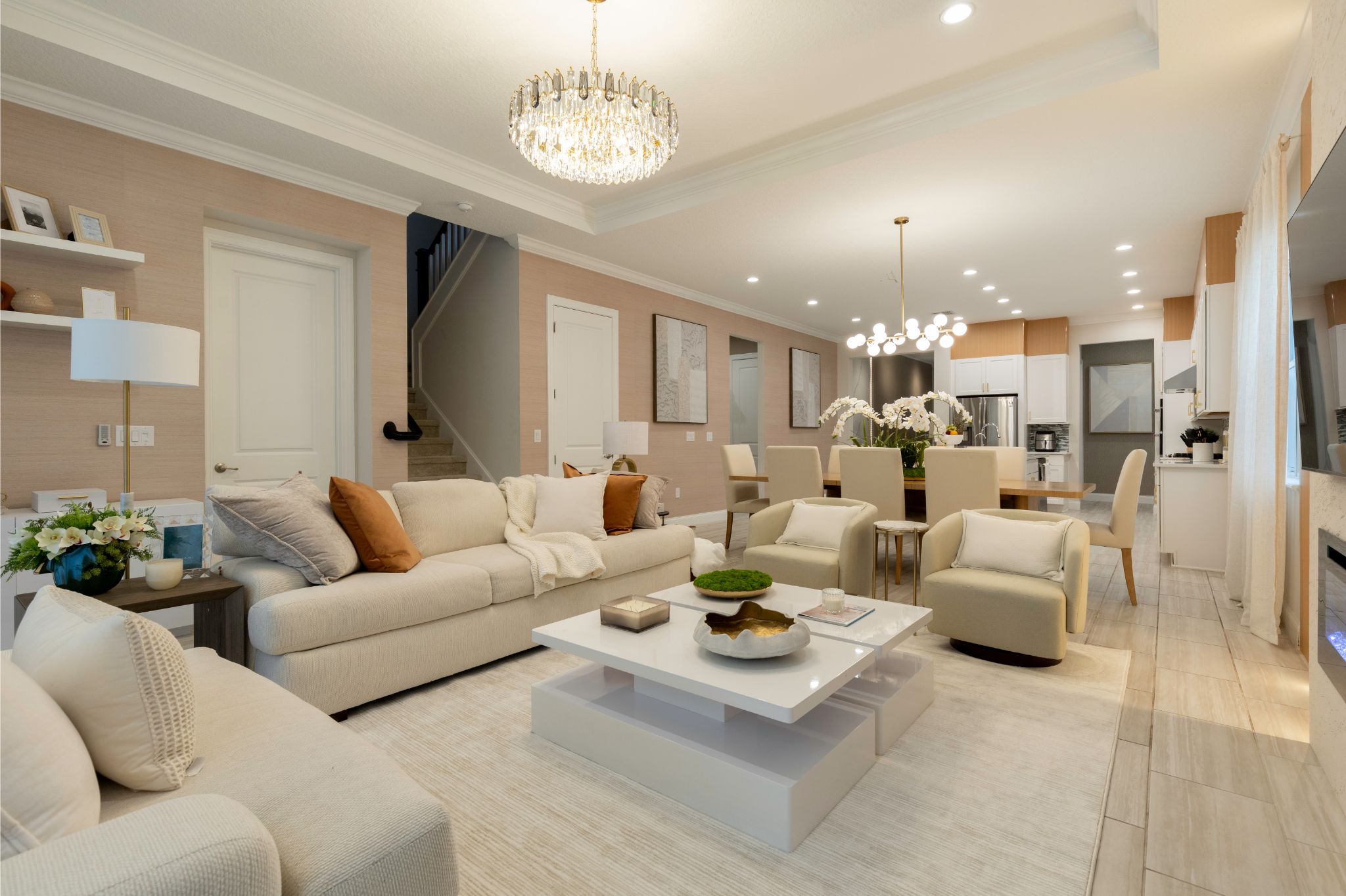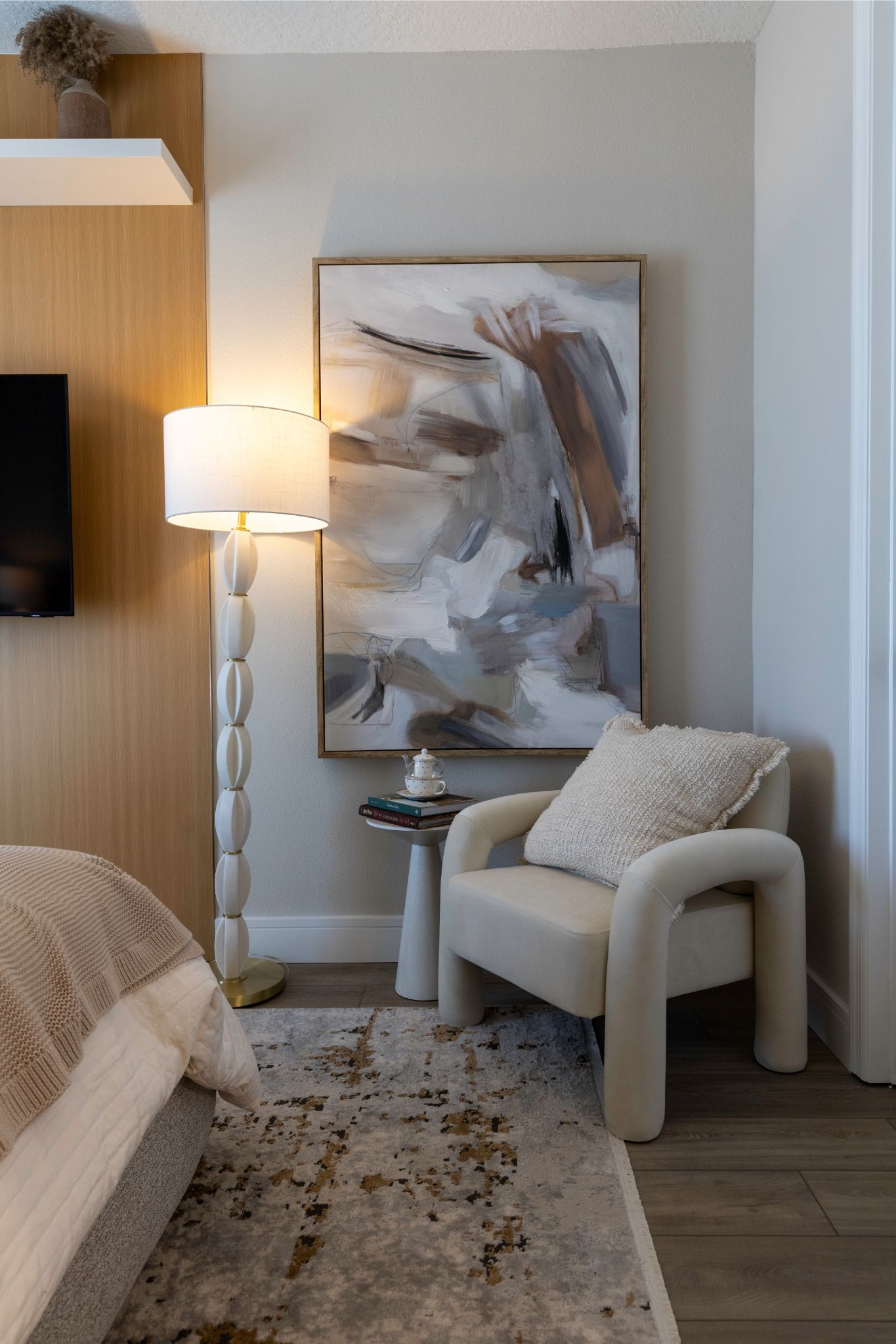 For this beautiful home, we transformed the main living area and bedroom into warm, serene spaces filled with texture and elegance. The open-concept living and dining room was designed to feel bright and welcoming, with a soft neutral palette, subtle lighting features, and a modern fireplace that adds a cozy focal point. In the bedroom, we created a calm and refined atmosphere using layered textiles, warm lighting, and custom shelving to bring both personality and practicality. Every detail was thoughtfully curated to make the home feel effortlessly stylish and truly comfortable.
